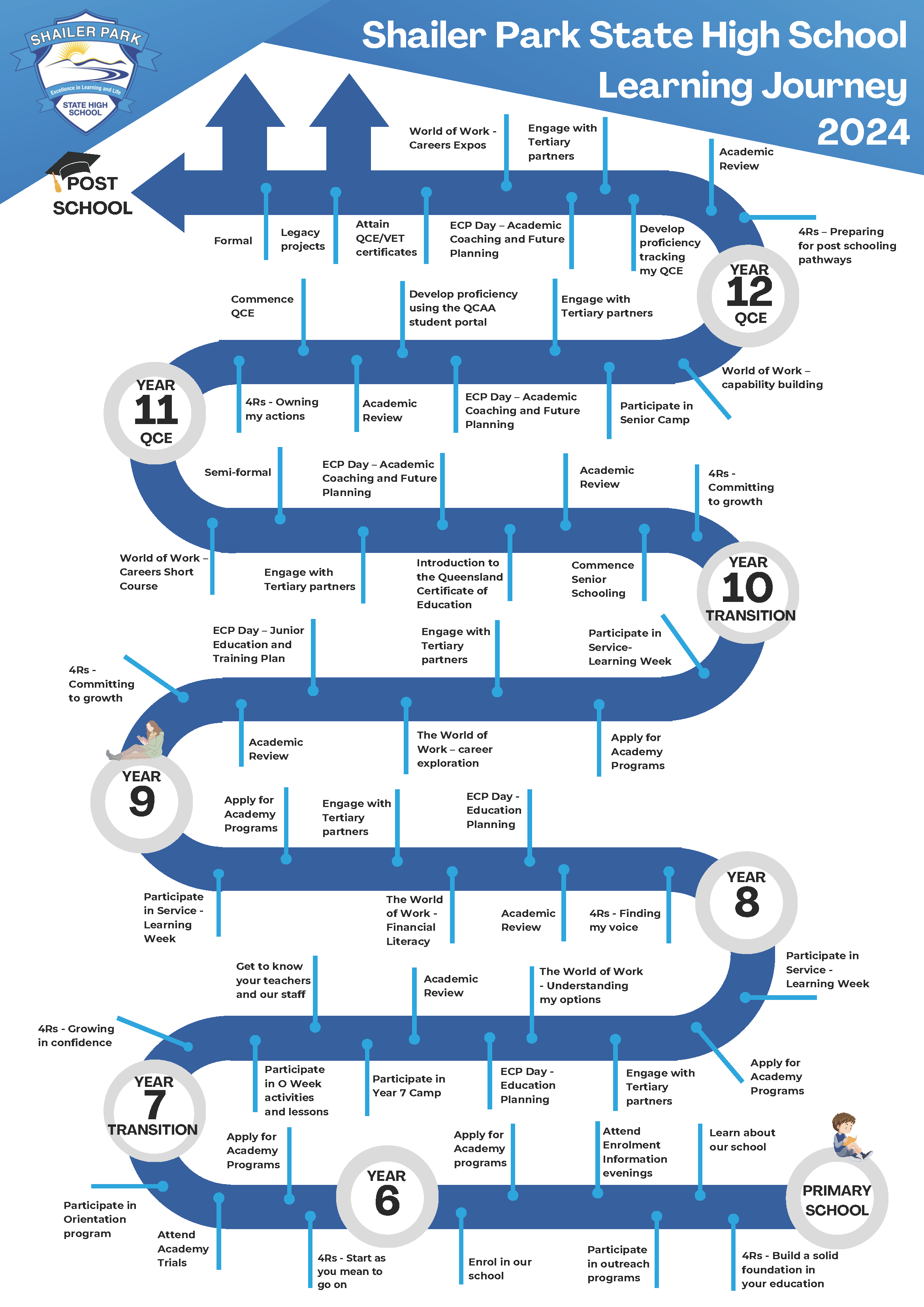 As shown in the 'Learning Journey,' Year 7 is an important transition year as students move from their primary school experience and settle into their secondary school years. Year 8 and Year 9 are important foundational years for students as they gain confidence and further knowledge as they prepare for the final years of secondary school.
